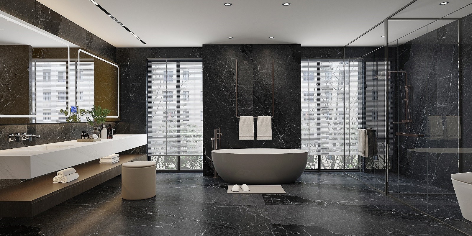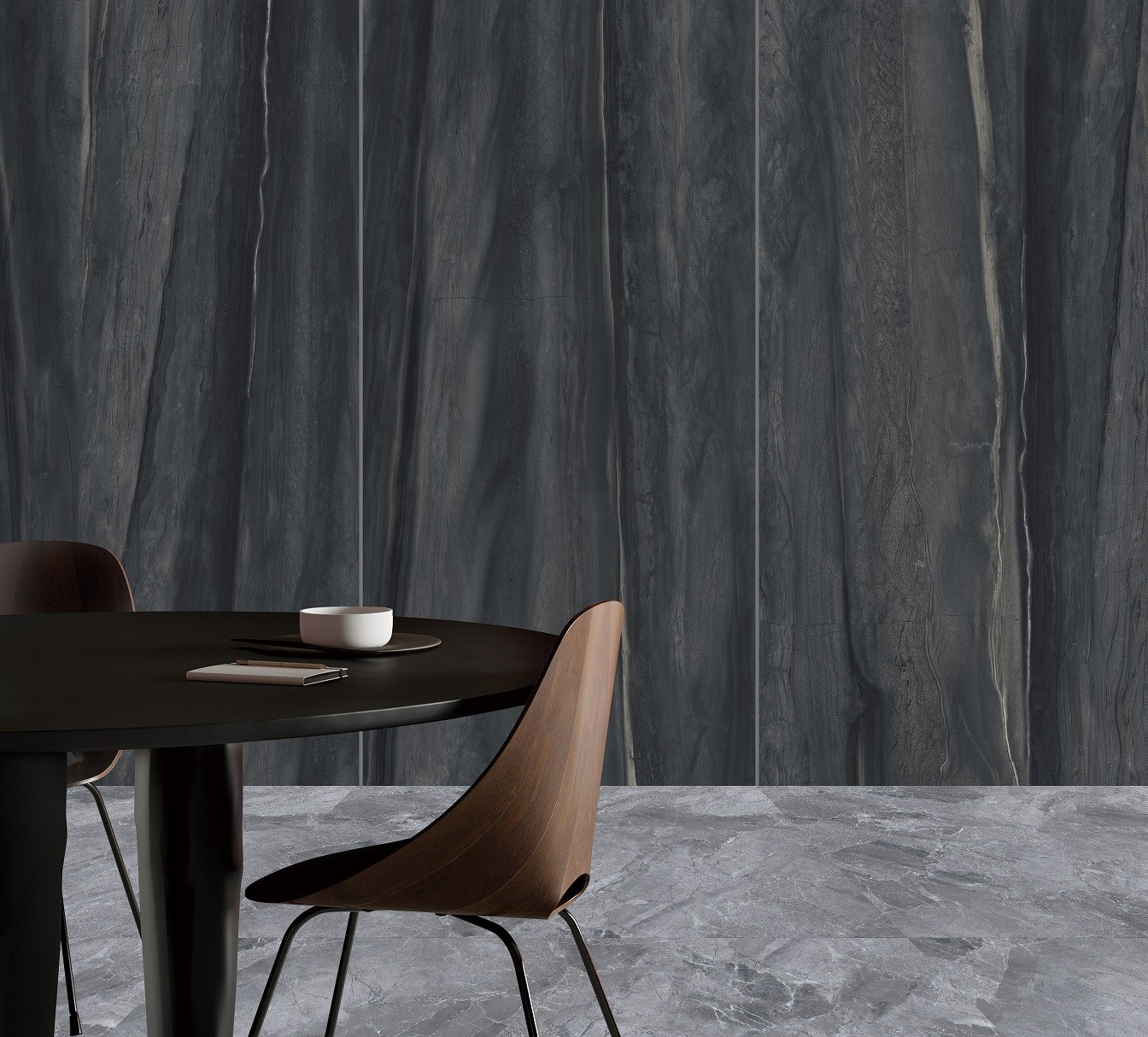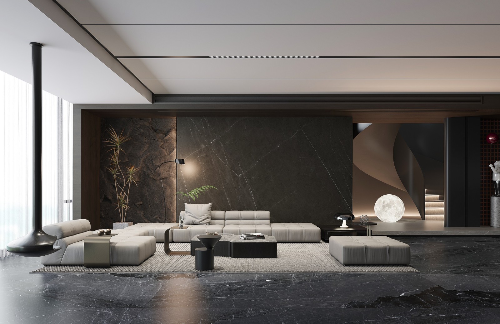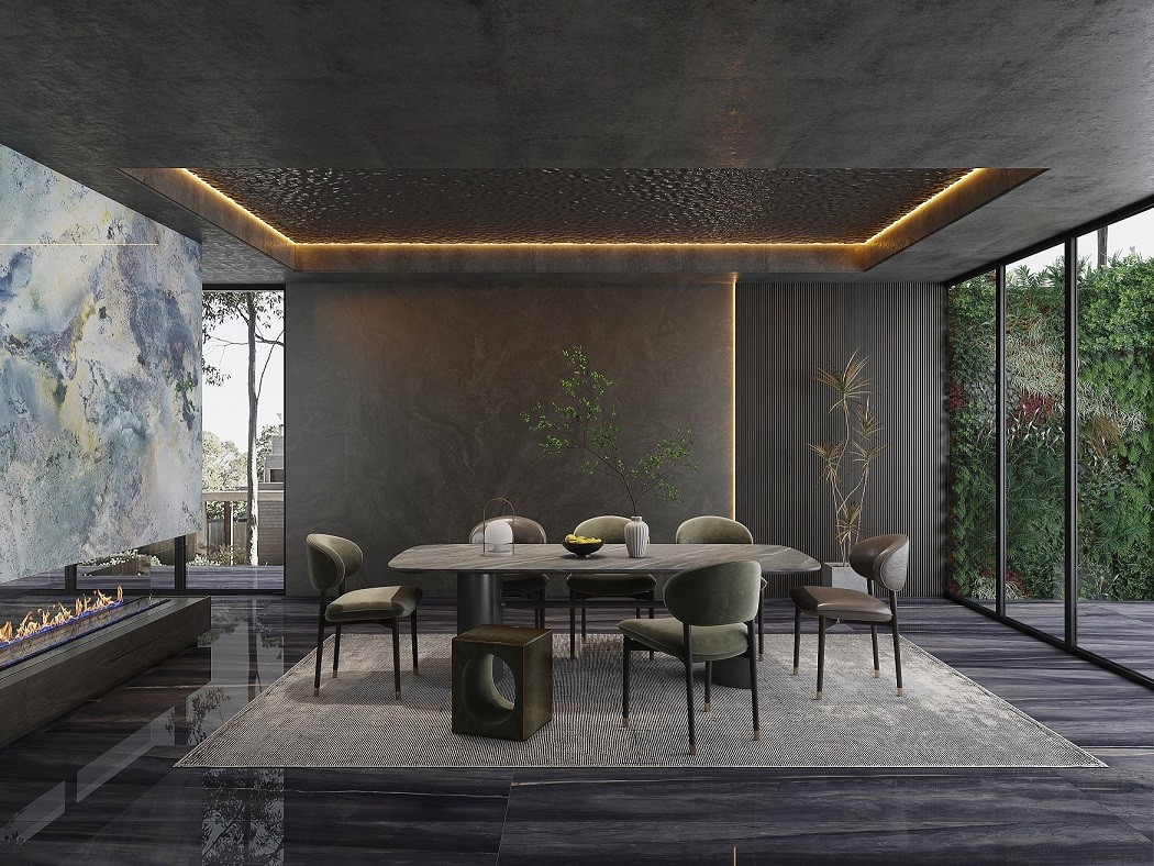 设计灵感:提炼于山水之色,黑石间的涓涓细流,柔和的光泽,使空间充满素雅基调,带来如时光交错的梦幻感。