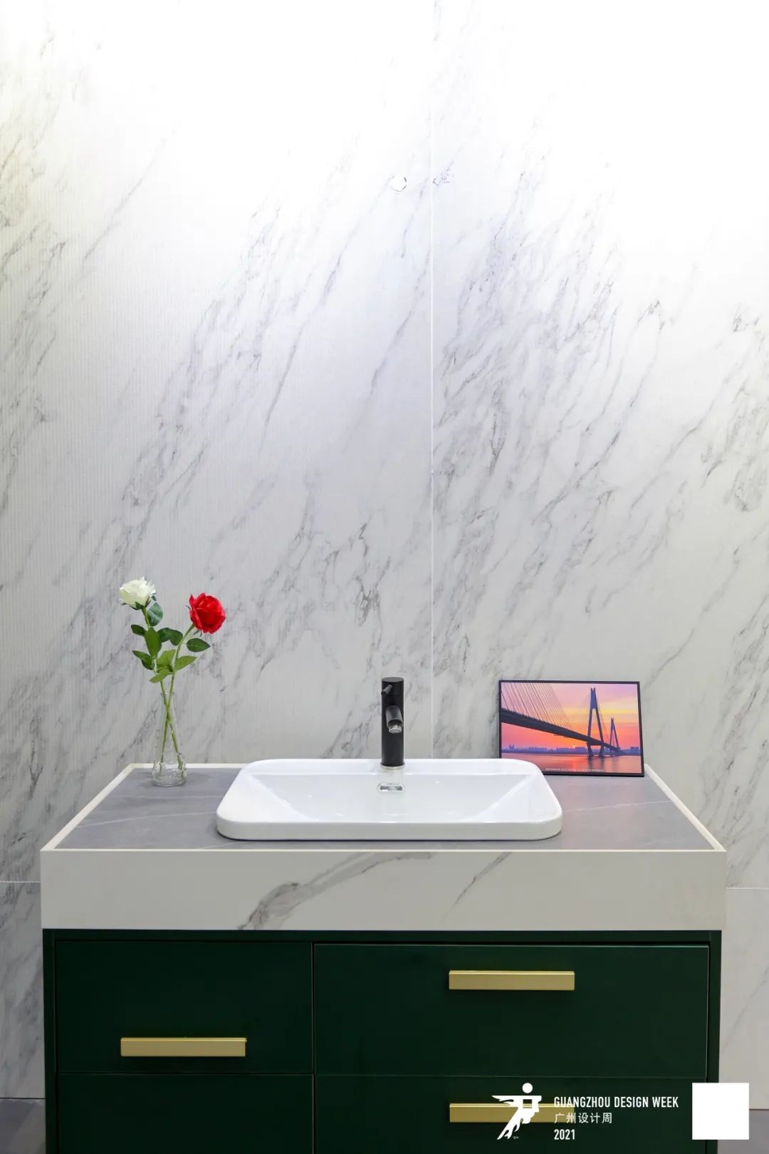 移步换景,一花一世界,一板一空间,卫浴空间也别有洞天。带有条纹拉槽的“罗克维尔白”作为背景宛如青烟幽起,为整个环境铺垫出诗意和优雅的氛围,即便是正视也极具层次感。而洗手台是由“冰山白”和“阿玛尼深灰”两种岩板定制而成,舒缓的色彩和花纹为忙碌的生活增添了一份恬静和淡雅。时光行也匆匆,坐也匆匆,不妨静下心来,看看诗和远方。