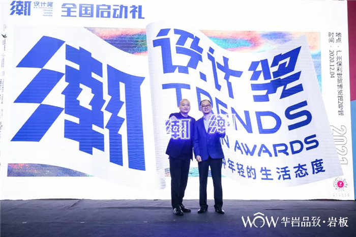 华岩品致副董事长郭聪先生登台,作为潮设计奖官方战略合作伙伴华岩品致的代表,与广州设计周执行总监贺文广先生共同点亮灯牌,启动潮设计奖2021年度评选。